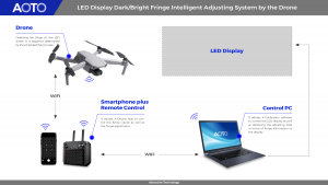 It is developed for the application of larger-sized display screens at height such as outdoor advertising and large-scale concerts. The drone can fly close to the display screen in order to get to the right place and complete the systematic configuration. This method is not constrained by the height of the screen, is not impacted by the surrounding environment, and can level any tricky angle. The scanning and processing range is significantly larger than that of a mobile phone (more than four times as large), and the effect is significantly enhanced.
