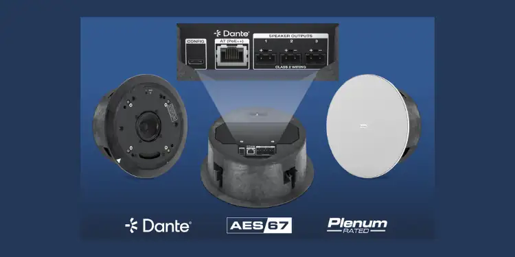 Extron has introduced their first PoE speaker, the NF 4C LP. This PoE powered 4” ceiling speaker system features scalable power, DSP, and Dante connectivity. Capable of driving up to three external passive speakers from its integrated four channel amplifier, the NF 4C LP is a single‑cable solution for individual zones within larger distributed ceiling speaker systems. Using Extron’s DSP Configurator Pro software, the integrated DSP can be set up independently for each amplifier channel with essential processing per zone. Dante Domain Manager and AES67 support ensure wide compatibility with enterprise configurations and other network audio devices.