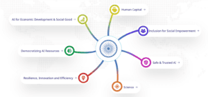 6. Democratizing AI Resources: This chakra envisions a global AI ecosystem where access to foundational enablers of AI development is equitable and affordable for all. For India, it expands access for startups, researchers, and public institutions while ensuring equitable participation in global AI value chains.