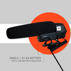 The microphone comes with a standard cold shoe mount for convenient installation on camera and an integrated shock mount to reduce mechanical & vibrational noise. JBL CSSG20 is powered by single 1.5V AA Battery and its low battery indicator gives users advance warning. The microphone can also be connected to the phone using the splitter with the provided 3.5mm jack.