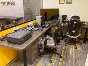 The space thus came up is a uniquely designed studio with two recoding rooms. The bigger room is equipped with a Hyundai interactive panel, and a motorised chroma screen, while the smaller studio has only the interactive panel for video, apart from the audio.